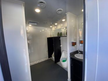 The 6-Stall Restroom Trailer is a great option for large events. This multi-stall unit features two exterior entries (men and women). The women's side offers three toilet stalls, and two sinks/vanity. On the men's side, the unit is equipped with two urinals, one toilet stall, and one sink/vanity.