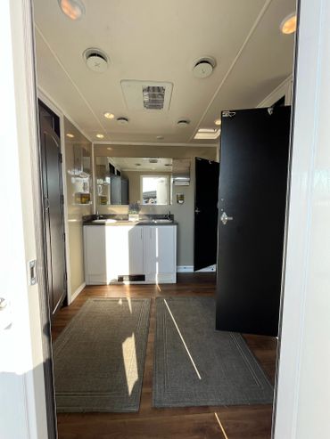 Our 4-Stall Restroom Trailer offers two different floor plans. One is a multi-stall unit featuring two exterior entries (men and women), with two toilet stalls and a sink/vanity on the women side and a toilet stall, a urinal, and a sink/vanity on the men's side. The other floor plan (pictured above) features four private stalls with exterior entrances. All four stalls feature a toilet and sink/vanity.