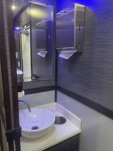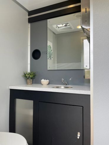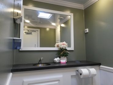 The new standard in portable bathroom rentals- our luxury restroom trailers come equipped with everything you need. The units feature flushing porcelian toilets, sinks with running water, vanities with large mirrors, climate control A/C and heat, indoor/outdoor lighting, and music. Each is tastefully decorated with rugs, art, and flowers and comes stocked with amenities. The trailers require power and water, but can be fully self-contained with a generator and use of the onboard water tank.