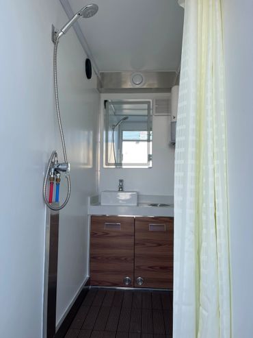 Our shower trailers are great for glamping events, festivals, remodels, job sites, cleanup efforts, and disaster relief. These shower trailers provide your guests or workers with private, convenient hot/cold shower facilities in a climate-controlled environment for year-round comfort. These units also include metered sinks and vanities, as well as interior and exterior lighting for maximized safety and ease of use.